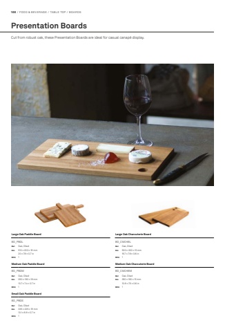 Large Oak Paddle BoardBO_PBOLMat Oak, OiledDim 510 %u00d7 200 %u00d7 18 mm20 %u00d7 7.9 %u00d7 0.7 inMOQ 1Medium Oak Paddle BoardBO_PBOMMat Oak, OiledDim 350 %u00d7 190 %u00d7 18 mm13.7 %u00d7 7.4 %u00d7 0.7 inMOQ 1Small Oak Paddle BoardBO_PBOSMat Oak, OiledDim 335 %u00d7 225 %u00d7 18 mm13.1 %u00d7 8.8 %u00d7 0.7 inMOQ 1Large Oak Charcuterie BoardBO_CMCHBLMat Oak, OiledDim 500 %u00d7 200 %u00d7 15 mm19.7 %u00d7 7.9 %u00d7 0.6 inMOQ 1Medium Oak Charcuterie BoardBO_CMCHBMMat Oak, OiledDim 350 %u00d7 190 %u00d7 15 mm13.8 %u00d7 7.5 %u00d7 0.6 inMOQ 1Presentation BoardsCut from robust oak, these Presentation Boards are ideal for casual canap%u00e9 display.100 / FOOD & BEVERAGE / TABLE TOP / BOARDS