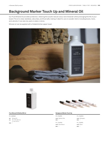 Background Marker Touch Up and Mineral OilOur Pure Mineral Oil provides protection, retaining the wood%u2019s natural colour and character while prolonging the life of your board. The oil is clear, tasteless, odourless, and food safe, making it ideal for use on wooden items including bowls, risers, and%u00a0utensils. It can also be used on slate or stone. Mineral oil can be applied with a folded kitchen paper towel.Pure Mineral Oil Bottle, 500 mlPC_MO1500Mat Mineral OilDim 52 %u00d7 118 %u00d7 500 mm2 %u00d7 4.6 %u00d7 19.7 inMOQ 1Background Marker Touch UpPC_TUMPO PC_TUMPM Colour Medium Oak Colour MahoganyMOQ 1 MOQ 1PC_TUMPW PC_TUMPB Colour Dark Walnut Colour BlackMOQ 1 MOQ 1%u2022 Denotes %u2018Gold%u2019 product FOOD & BEVERAGE / TABLE TOP / BOARDS / 101