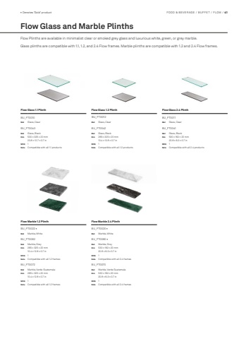 Flow Glass and Marble PlinthsFlow Plinths are available in minimalist clear or smoked grey glass and luxurious white, green, or grey marble. Glass plinths are compatible with 1.1, 1.2, and 2.4 Flow frames. Marble plinths are compatible with 1.2 and 2.4 Flow frames.Flow Glass 1.1 PlinthBU_FT0010 Mat Glass, ClearBU_FT0040 Mat Glass, BlackDim 530 %u00d7 325 %u00d7 20 mm20.8 %u00d7 12.7 %u00d7 0.7 inMOQ 1Note Compatible with all 1.1 productsFlow Glass 1.2 PlinthBU_FT0012 Mat Glass, ClearBU_FT0042 Mat Glass, BlackDim 265 %u00d7 325 %u00d7 20 mm10.4 %u00d7 12.8 %u00d7 0.7 inMOQ 1Note Compatible with all 1.2 productsFlow Glass 2.4 PlinthBU_FT0011 Mat Glass, ClearBU_FT0041 Mat Glass, BlackDim 530 %u00d7 162 %u00d7 20 mm20.8 %u00d7 6.3 %u00d7 0.7 inMOQ 1Note Compatible with all 2.4 productsFlow Marble 1.2 PlinthBU_FT0022 %u2022Mat Marble, WhiteBU_FT0062Mat Marble, GreyDim 265 %u00d7 325 %u00d7 20 mm10.4 %u00d7 12.8 %u00d7 0.7 inMOQ 1Note Compatible with all 1.2 framesBU_FT0072Mat Marble, Verde GuatemalaDim 265 %u00d7 325 %u00d7 20 mm10.4 %u00d7 12.8 %u00d7 0.7 inMOQ 1Note Compatible with all 1.2 framesFlow Marble 2.4 PlinthBU_FT0020 %u2022Mat Marble, WhiteBU_FT0060 %u2022Mat Marble, GreyDim 530 %u00d7 162 %u00d7 20 mm20.8 %u00d7 6.3 %u00d7 0.7 inMOQ 1Note Compatible with all 2.4 framesBU_FT0070Mat Marble, Verde GuatemalaDim 530 %u00d7 162 %u00d7 20 mm20.8 %u00d7 6.3 %u00d7 0.7 inMOQ 1Note Compatible with all 2.4 frames%u2022 Denotes %u2018Gold%u2019 product FOOD & BEVERAGE / BUFFET / FLOW / 41