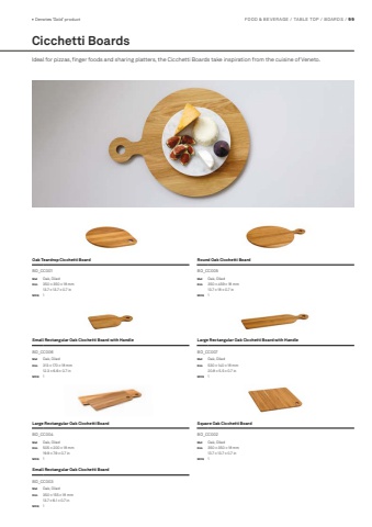 Cicchetti BoardsIdeal for pizzas, finger foods and sharing platters, the Cicchetti Boards take inspiration from the cuisine of Veneto.Oak Teardrop Cicchetti BoardBO_CC001 Mat Oak, OiledDim 350 %u00d7 350 %u00d7 18 mm13.7 %u00d7 13.7 %u00d7 0.7 inMOQ 1Small Rectangular Oak Cicchetti Board with HandleBO_CC006Mat Oak, OiledDim 313 %u00d7 170 %u00d7 18 mm12.3 %u00d7 6.6 %u00d7 0.7 inMOQ 1Round Oak Cicchetti BoardBO_CC005 Mat Oak, OiledDim 350 %u00d7 459 %u00d7 18 mm13.7 %u00d7 18 %u00d7 0.7 inMOQ 1Large Rectangular Oak Cicchetti Board with HandleBO_CC007 Mat Oak, OiledDim 530 %u00d7 140 %u00d7 18 mm20.8 %u00d7 5.5 %u00d7 0.7 inMOQ 1Square Oak Cicchetti BoardBO_CC002Mat Oak, OiledDim 350 %u00d7 350 %u00d7 18 mm13.7 %u00d7 13.7 %u00d7 0.7 inMOQ 1Large Rectangular Oak Cicchetti BoardBO_CC004Mat Oak, OiledDim 505 %u00d7 200 %u00d7 18 mm19.9 %u00d7 7.9 %u00d7 0.7 inMOQ 1Small Rectangular Oak Cicchetti BoardBO_CC003 Mat Oak, OiledDim 350 %u00d7 155 %u00d7 18 mm13.7 %u00d7 6.1 %u00d7 0.7 inMOQ 1%u2022 Denotes %u2018Gold%u2019 product FOOD & BEVERAGE / TABLE TOP / BOARDS / 99